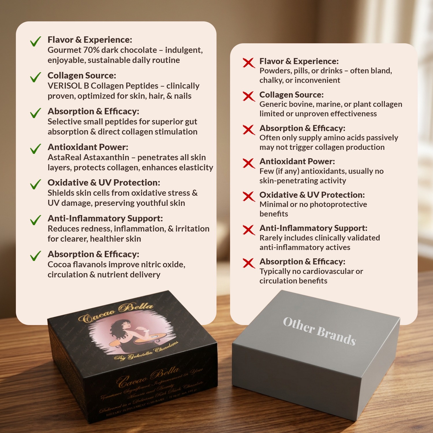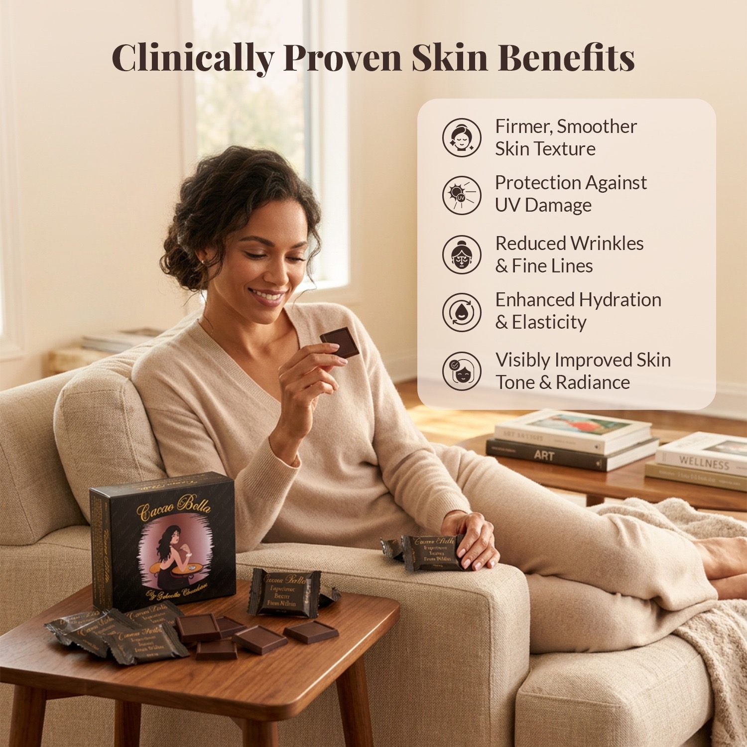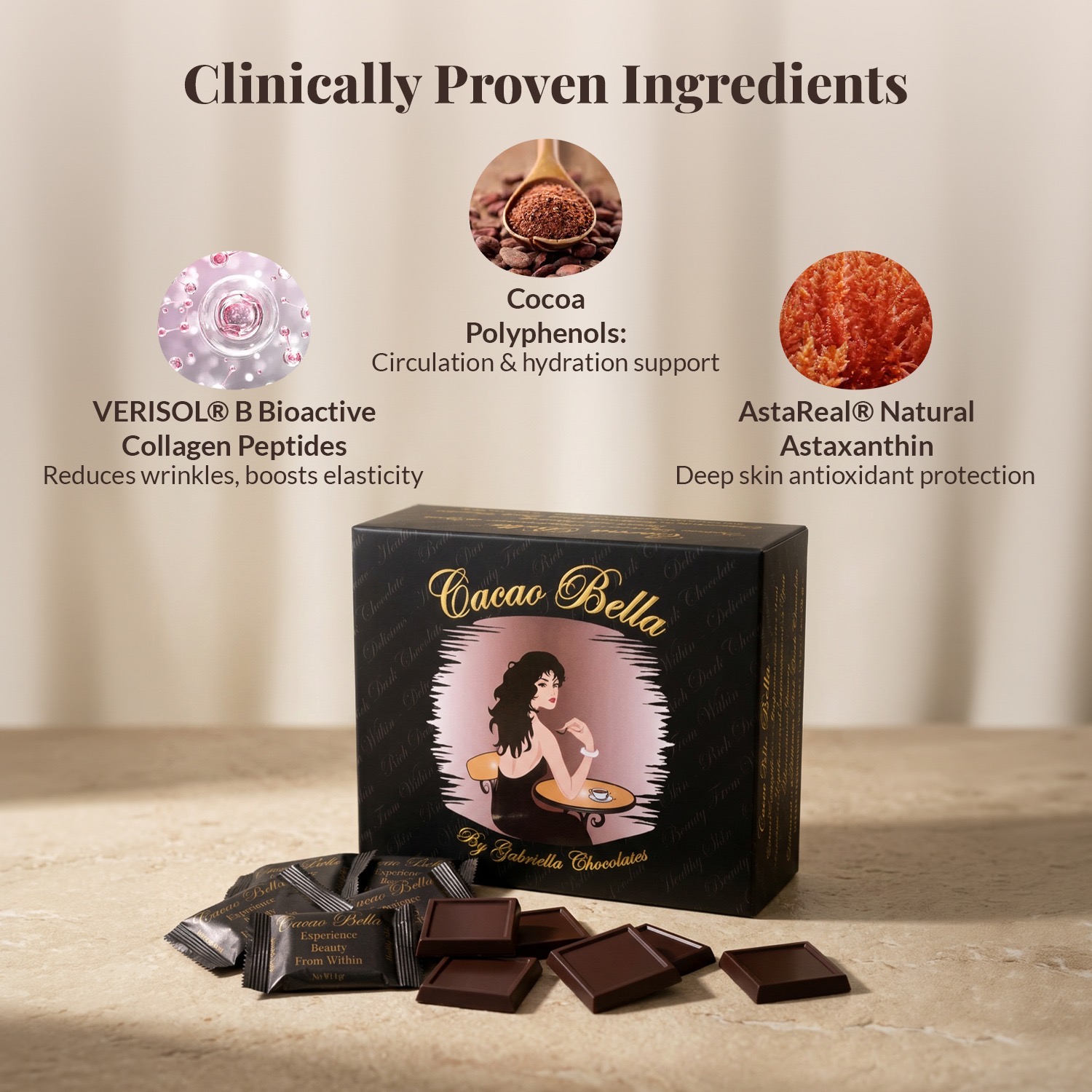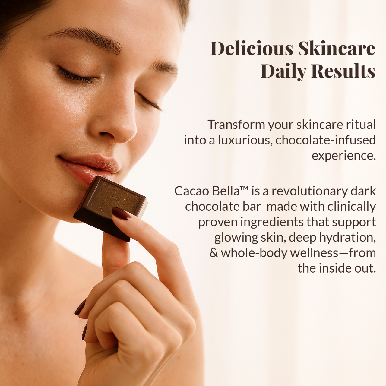 Cacao Bella® combines clinically studied collagen, powerful antioxidants, and cocoa flavanols into one indulgent dark chocolate bar—designed to support smoother, more hydrated, radiant-looking skin from within.