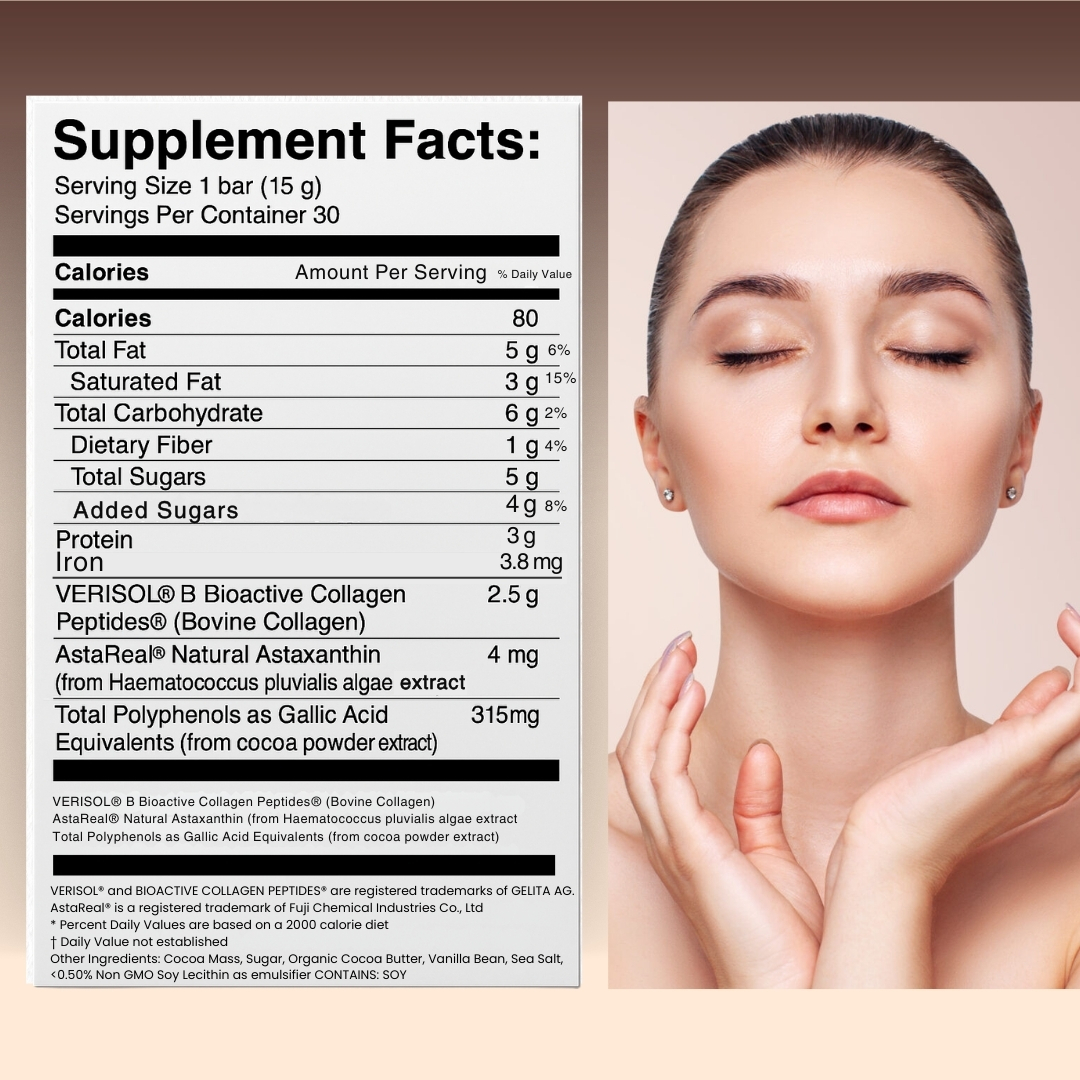 Each daily bar combines clinically studied ingredients in a rich, premium dark chocolate format—making Cacao Bella® a convenient and enjoyable chocolate collagen supplement.